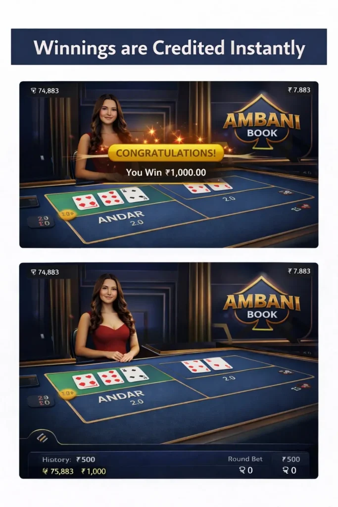 If the player has placed a bet on the winning side, the payout is credited immediately to the Ambani Book account. This fast and seamless process ensures uninterrupted gameplay and a smooth user experience.